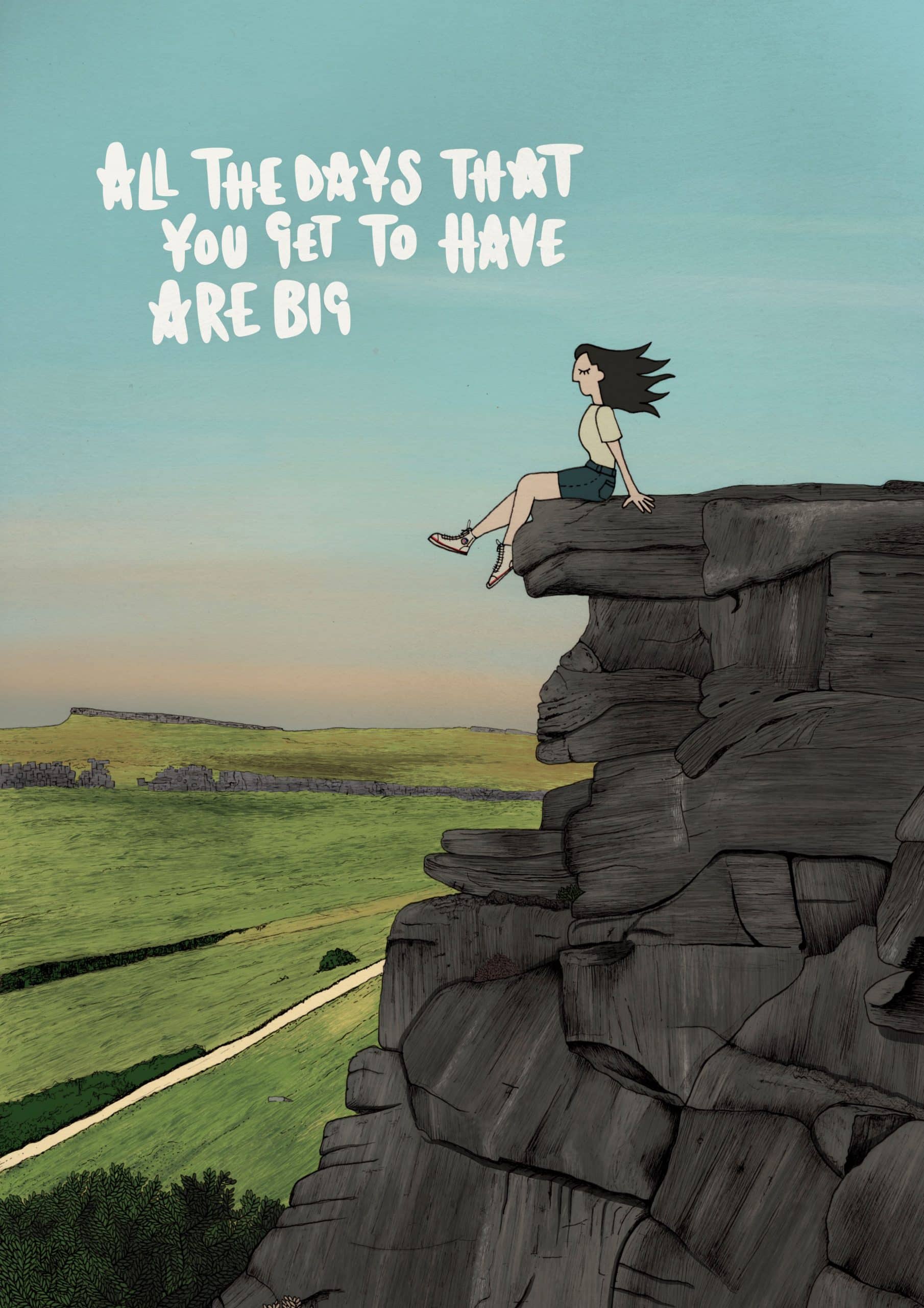 After sharing a commission I’d recently finished I got a lot of requests to use these lyrics in a a print… your wish is my command. The imagery came to me quite quickly. For me it was that feeling, not matter how big or small it was that you just feel alive and on top of the world. I see so many people doing this, personally it’s my worst nightmare as I have a fear of heights but I can imagine the feeling of freedom it gives. Lyrics from Self Esteem song I do this all the time