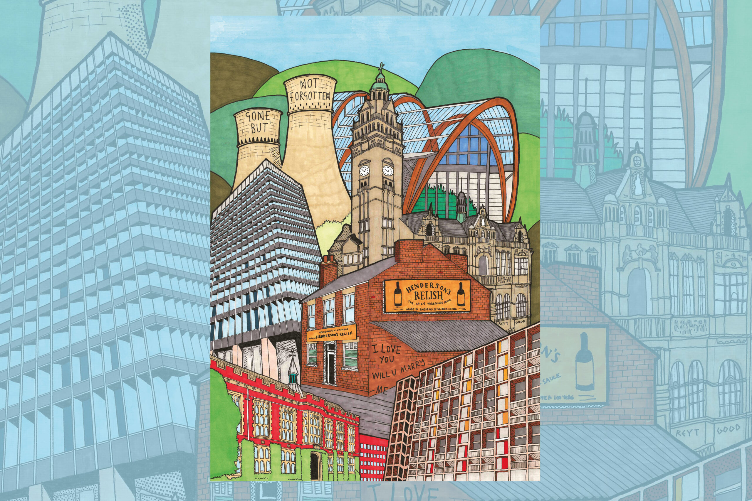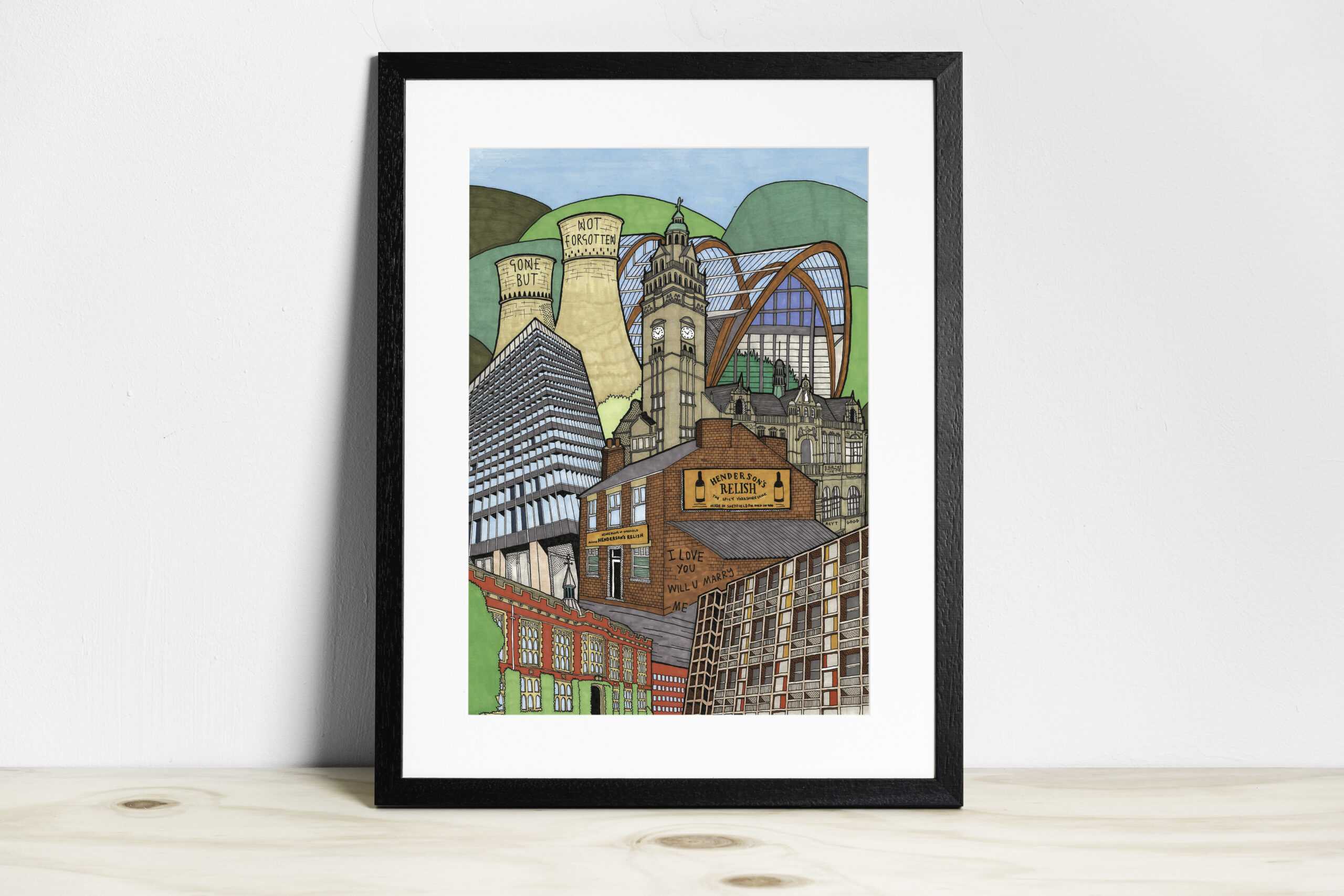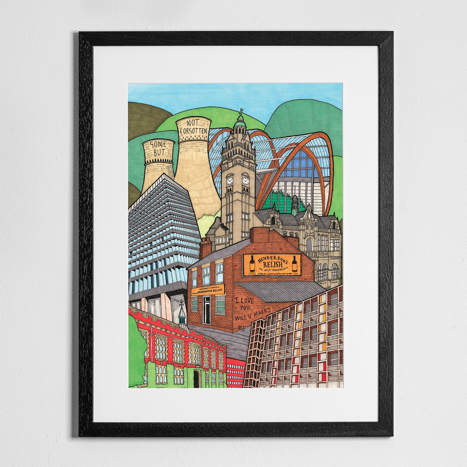 Hendos Sheffield City Print – Print from original artwork featuring some of Sheffield’s most iconic landmarks.