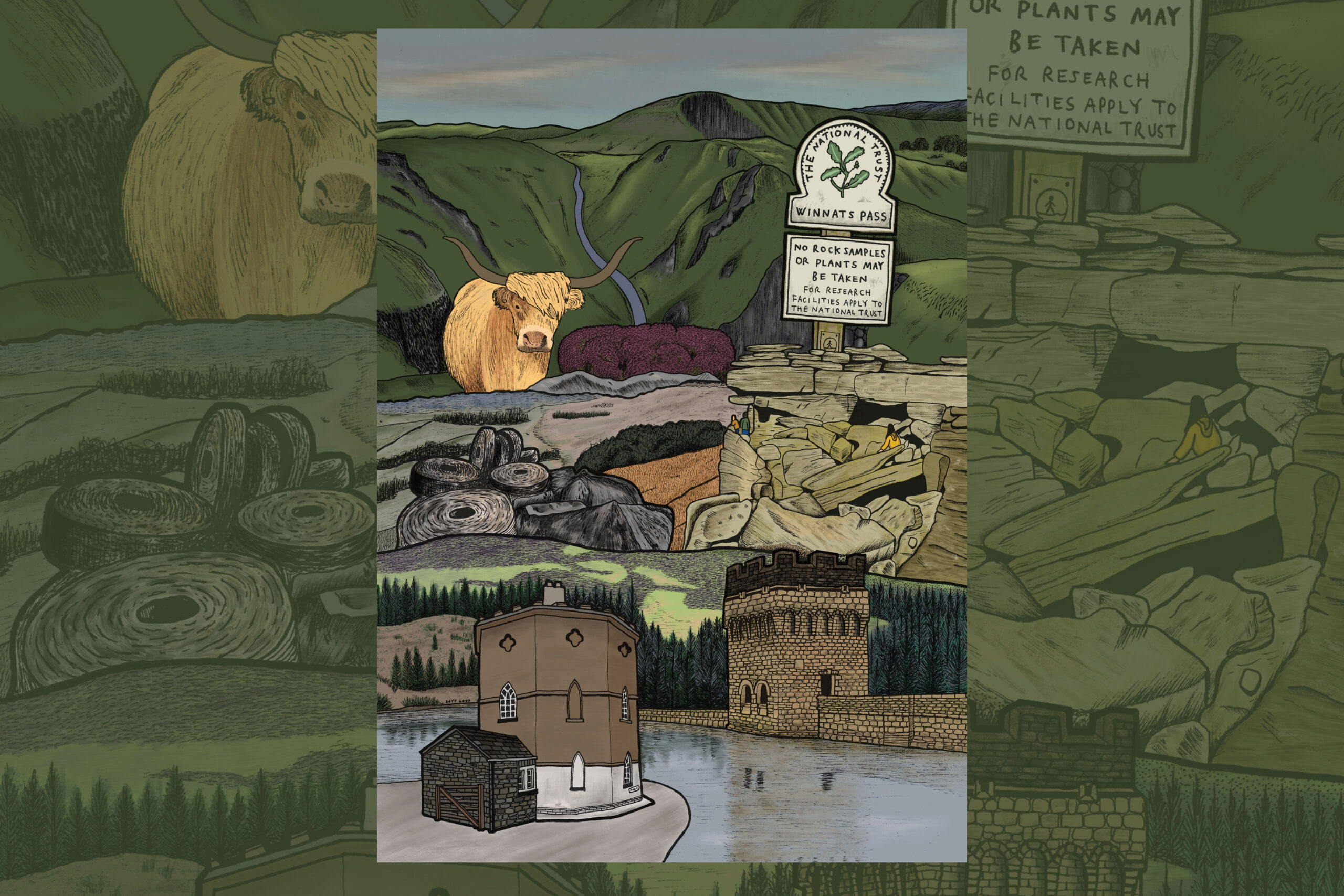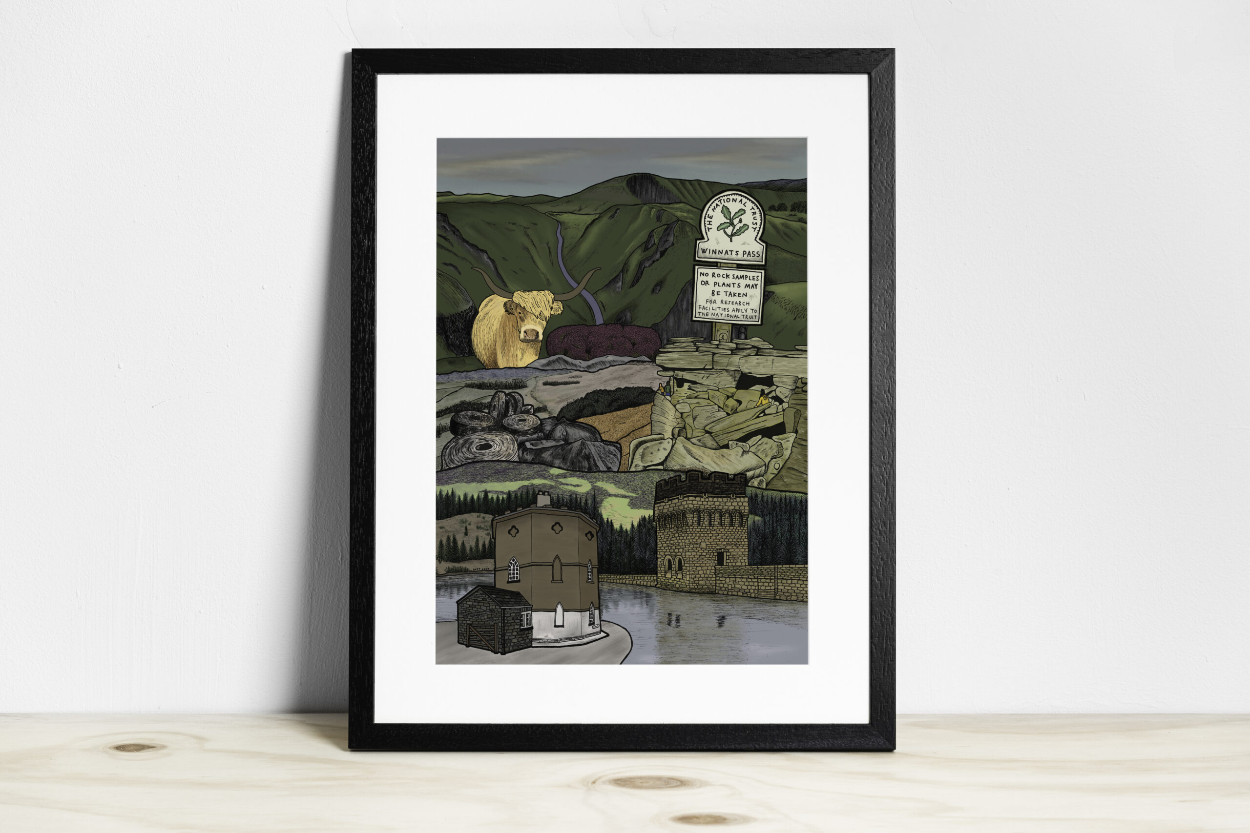 Original artwork featuring Lady Bower dam and view of the Peak District.