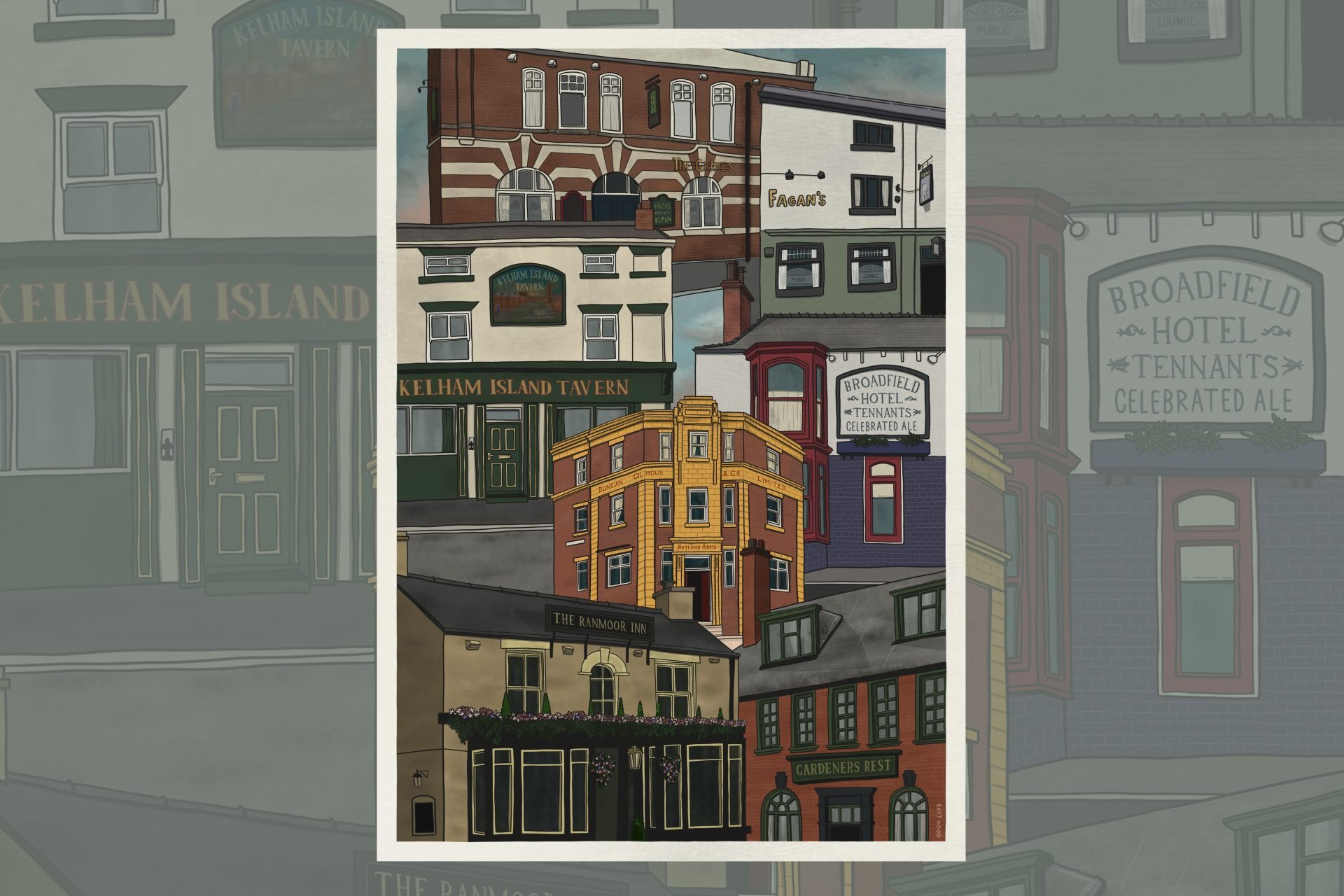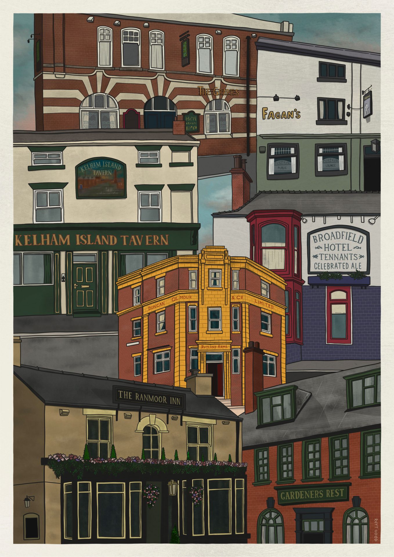 Sheffield Pubs 1 is my first cityscape style print featuring the many great pubs Sheffield has. I am sure everyone has their own favourites but these are just a few of mine, I’m sure you’ll love most of these as much as I do.