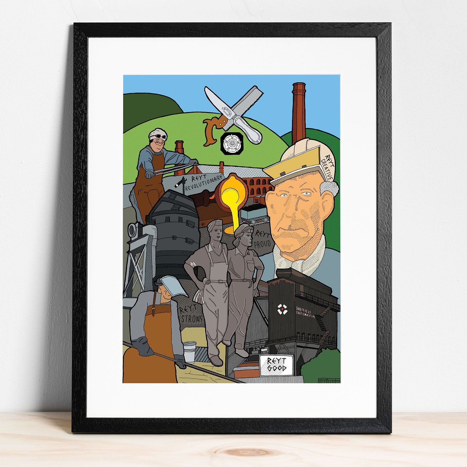 Print for original artwork celebrating Sheffield’s rich heritage in the Steel industry. The perfect gift for any “Reyt Proud” Sheffielder or adopted Sheffielder