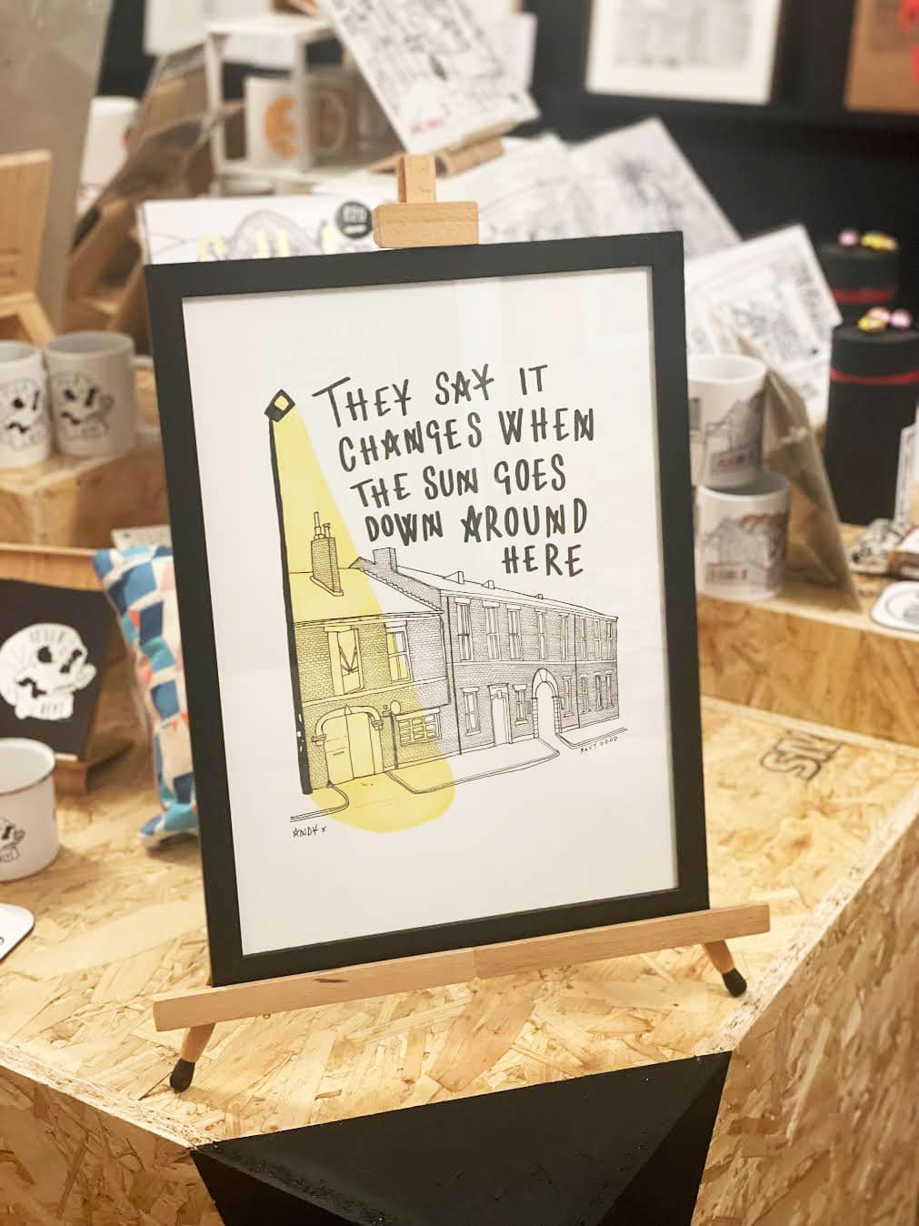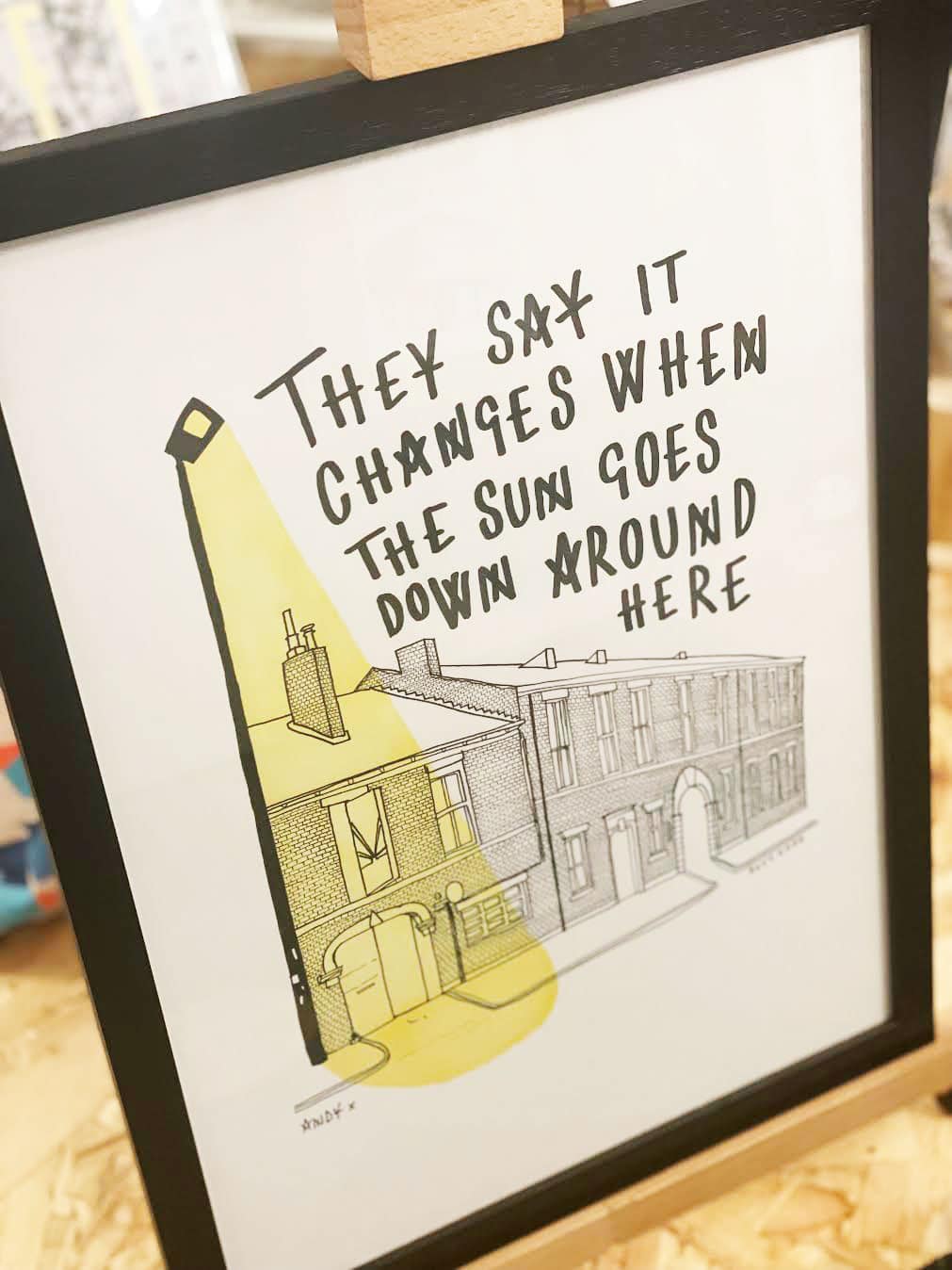 Working just down the road from Yellow Arch studios in Sheffield, and being such a massive Arctic Monkeys fan, I was always think of their song “When the sun goes down’ whenever I walk past. I love all the old industrial brick buildings in the Kelham Island/Neepsend area of Sheffield and it’s always such a joy to draw them.