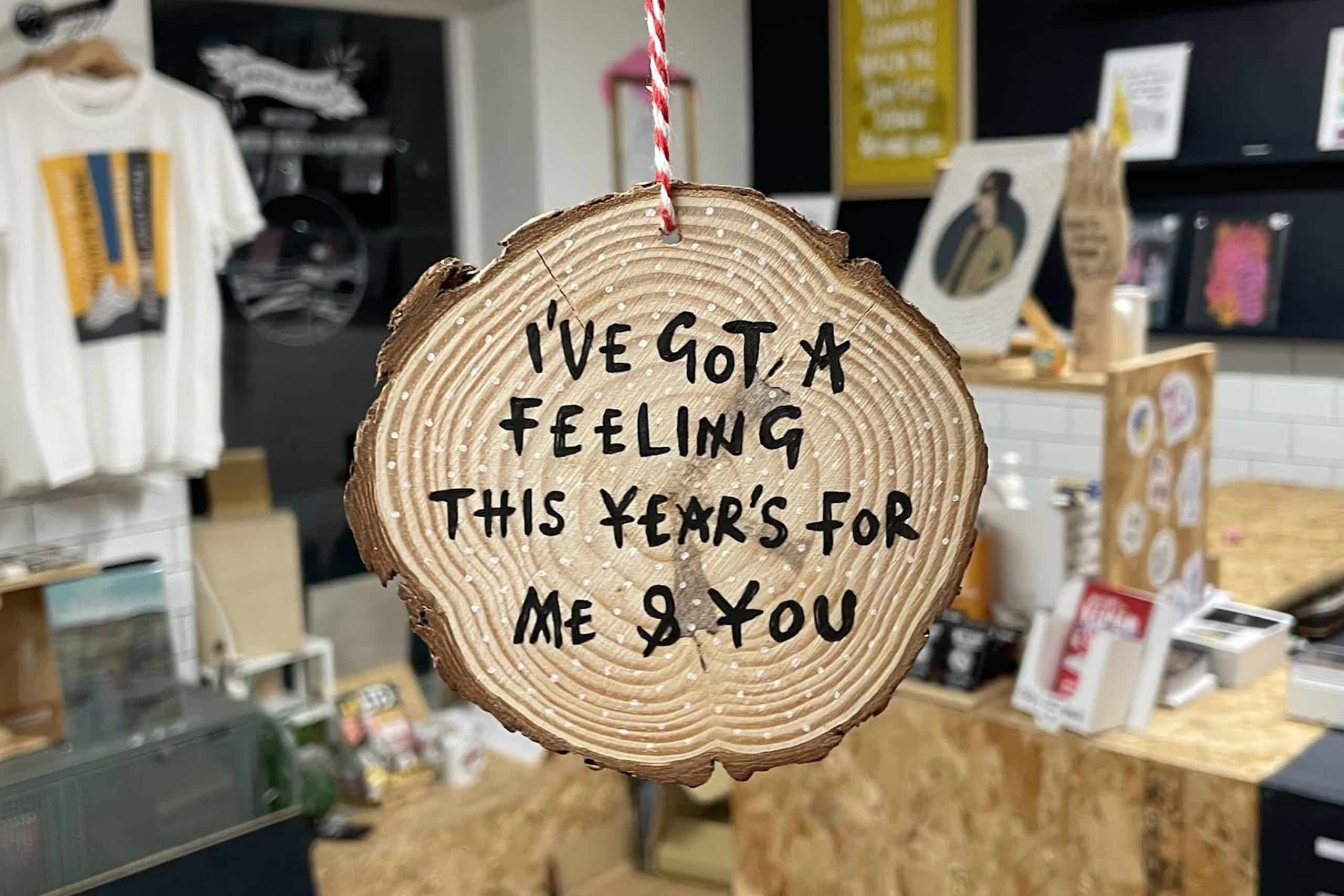 This year's for you and meHandmade Christmas tree decoration on wood with bark rim. Hand written double sided with Posca pens.Approx 11cm diameter but sizes may differ slightly.Double sidedDouble sidedÂ